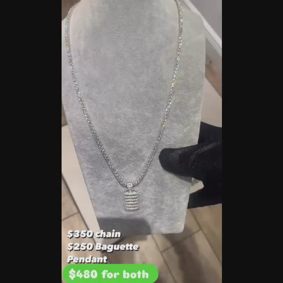 Sterling Silver Moissanite Baguette Pendant Iced Out Tennis Chain Set